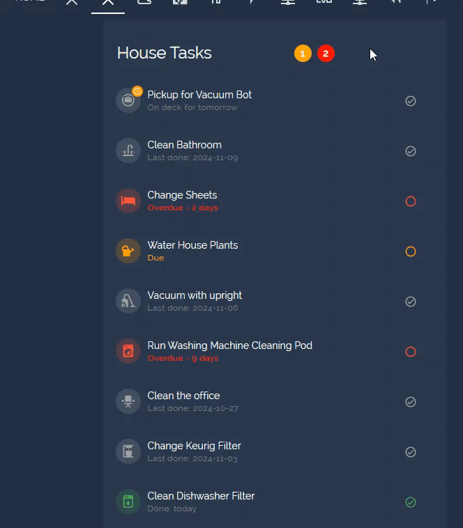 It’s been a few years since I wrote a brief “how-to” guide to create a task tracker in Home Assistant. At the time I positioned it as a chore tracker for my kids. And not surprisingly, despite my efforts to make it more appealing, they never got into it. I get it, no one likes doing chores! Until recently, that was it, nobody used it. I was even debating whether to pull it out entirely when I concluded that having such a feature in Home Assistant made much more sense for certain recurring tasks than tracking them somewhere else. Using existing infrastructure for state tracking, notifications, alerts, and dashboards are good reasons to include recurring tasks in Home Assistant, but I didn’t enough consideration before to more nuanced downstream automation opportunities. Sure there’s automatically start a process once a task is completed like picking up the house before the vacuum bot is run, think enough about the automation potential before.